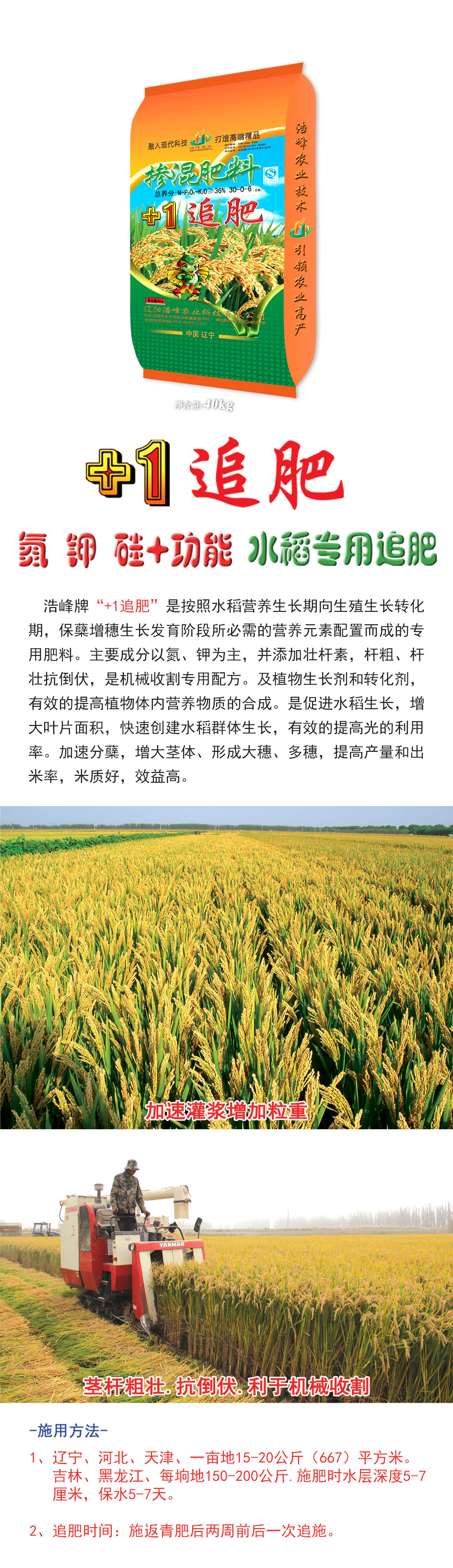 浩峰牌“+1追肥”是按照水稻營養(yǎng)生長期向生殖生長轉(zhuǎn)化期,保蘗增穗生長發(fā)育階段所必需的營養(yǎng)元素配置而成的專用肥料。主要成分以氮、鉀為主,并添加壯桿素,桿粗、桿壯抗倒伏,是機(jī)械收割專用配方。及植物生長劑和轉(zhuǎn)化劑,有效的提高植物體內(nèi)營養(yǎng)物質(zhì)ず銑傘J譴俳舊?,札e笠鍍婊燜俅唇ㄋ救禾逕?,有效的提高光的利用率。尖欃分蘖,札e缶ヌ?、芯暭嗴穗、多穗,提高产量航y(tǒng)雒茁?,米质好,效益高?