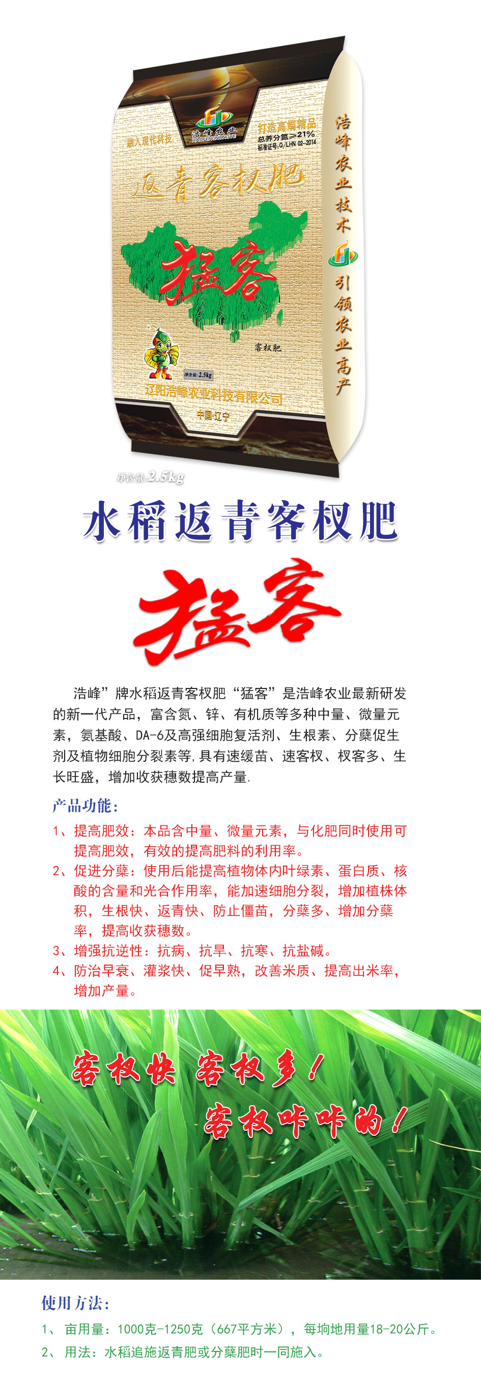 浩峰”牌水稻返青客杈肥“猛客”是浩峰農(nóng)業(yè)最新研發(fā)的新一代產(chǎn)品,富含氮、鋅、有機(jī)質(zhì)等多種中量、微量元素,氨基酸、DA-6及高強(qiáng)細(xì)胞復(fù)活劑、生根素、分蘗促生劑及植物細(xì)胞分裂素等,具有速緩苗、速客杈、杈客多、生長(zhǎng)旺盛,增加收獲穗數(shù)提高產(chǎn)量。