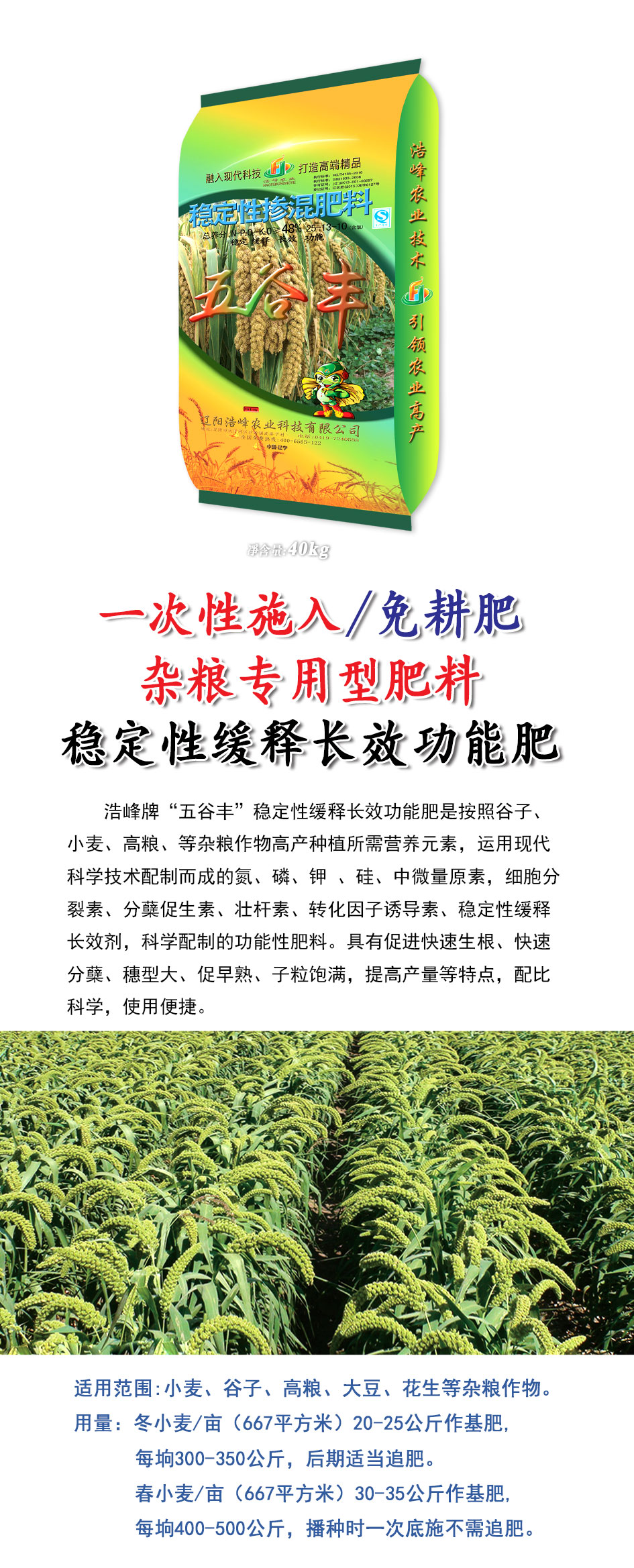 浩峰牌“五谷豐”穩(wěn)定性緩釋長(zhǎng)效功能肥是按照谷子、小麥、高糧、等雜糧作物高產(chǎn)種植所需營(yíng)養(yǎng)元素,運(yùn)用現(xiàn)代科學(xué)技術(shù)配制而成的氮、磷、鉀 、硅、中微量原素,細(xì)胞分裂素、分蘗促生素、壯桿素、轉(zhuǎn)化因子誘導(dǎo)素、穩(wěn)定性緩釋長(zhǎng)效劑,科學(xué)配制的功能性肥料。具有促進(jìn)快速生根、快速分蘗、穗型大、促早熟、子粒飽滿,提高產(chǎn)量等特點(diǎn),配比科學(xué),使用便捷。